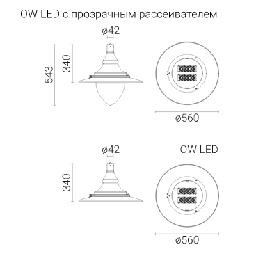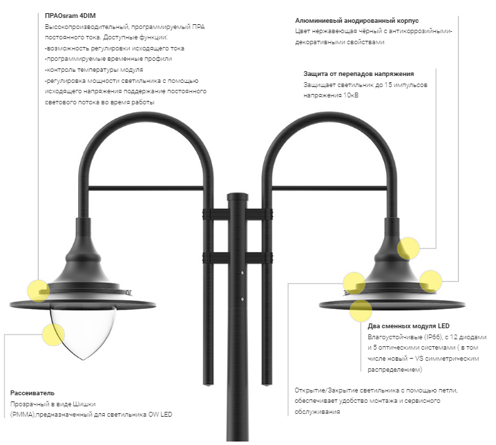 Монтаж: на опорах с оголовниками, оголовниках, бра с окончанием ø42 x 40 мм