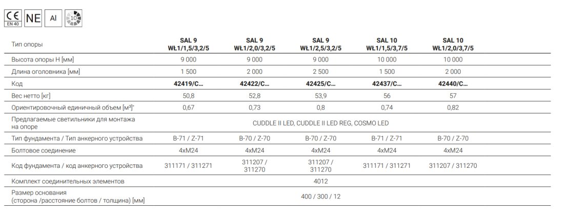 Монтаж светильника: непосредственно на оголовнике опоры, светильники с креплением ø60 мм с параметрами веса и поверхности, которые не превышают данных из таблицы выдержанности указанных в технической карте.