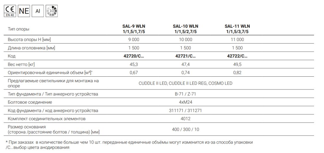 Монтаж светильника: непосредственно на оголовнике опоры, светильники с креплением ø60 мм с параметрами веса и поверхности, которые не превышают данных из таблицы выдержанности указанных в технической карте.