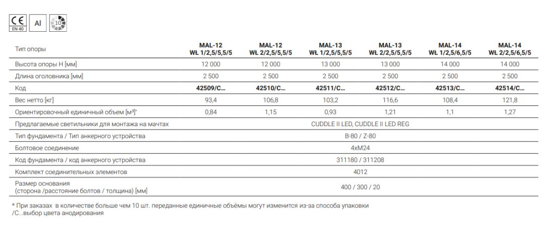 Монтаж светильника: непосредственно на мачте, светильники с креплением ø60 мм с параметрами веса и поверхности, которые не превышают данных из таблицы выдержанности указанных в технической карте.