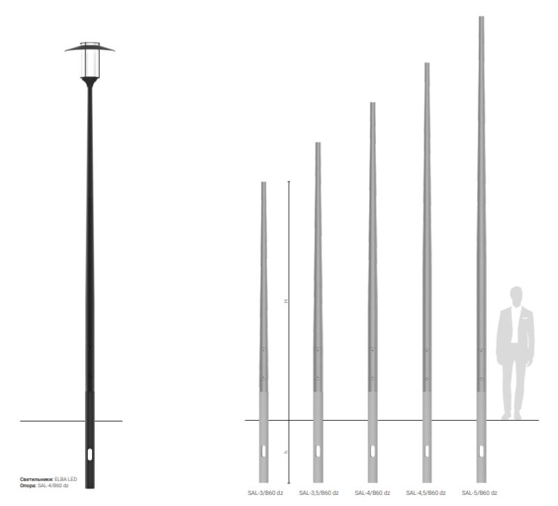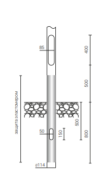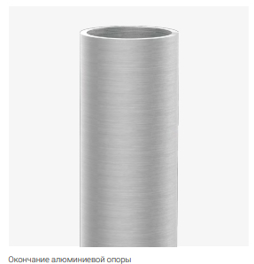 Материал: шлифованный, анодированный алюминий, вкапываемые опоры в стандарте поставляются с защитным эластомером в цвет опоры до высоты 350 мм (другая высота по желанию клиента)