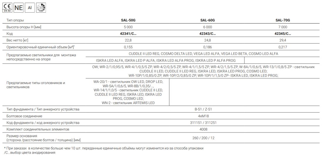 Монтаж светильника: непосредственно на опоре, светильники с креплением ø60 мм с параметрами веса и поверхности, которые не превышают данных из таблицы выдержанности указанных в технической карте