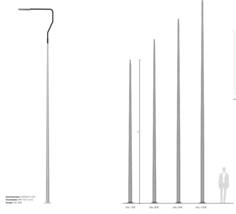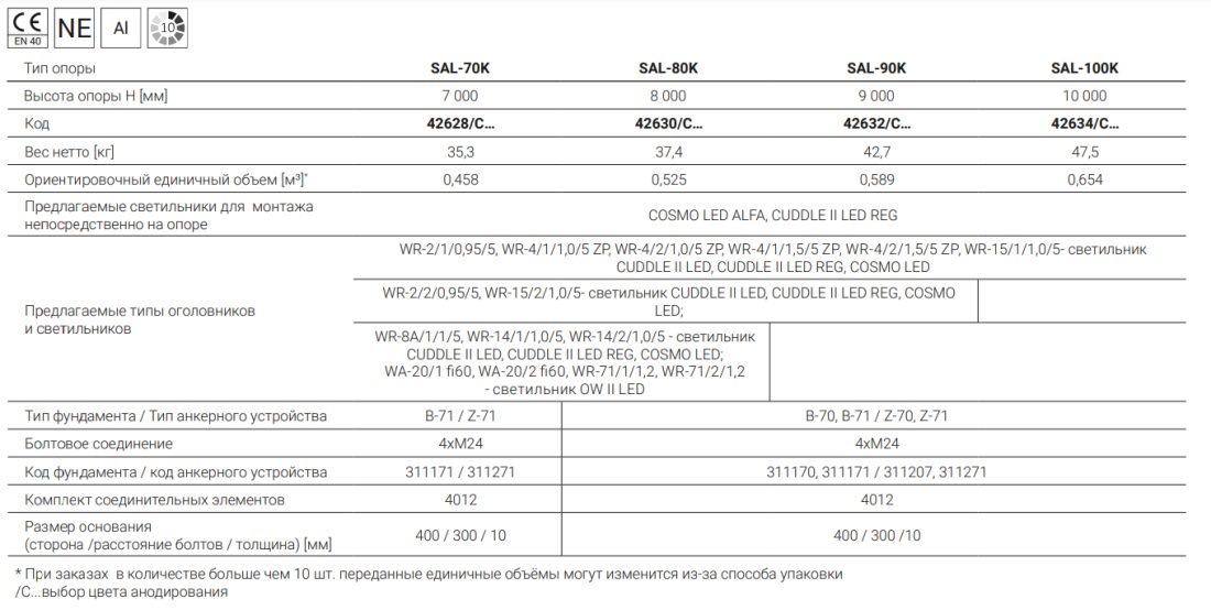 Монтаж светильника: непосредственно на опоре, светильники с креплением ø60 мм с параметрами веса и поверхности, которые не превышают данных из таблицы выдержанности указанных в технической карте.