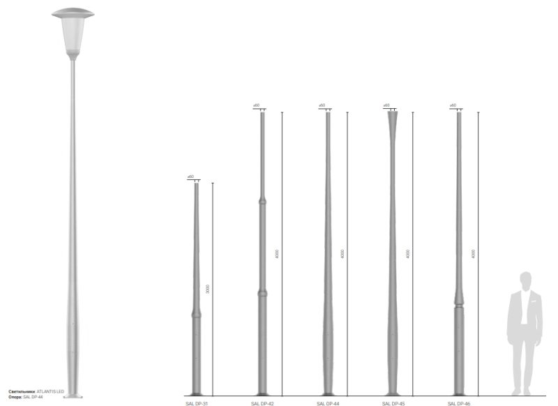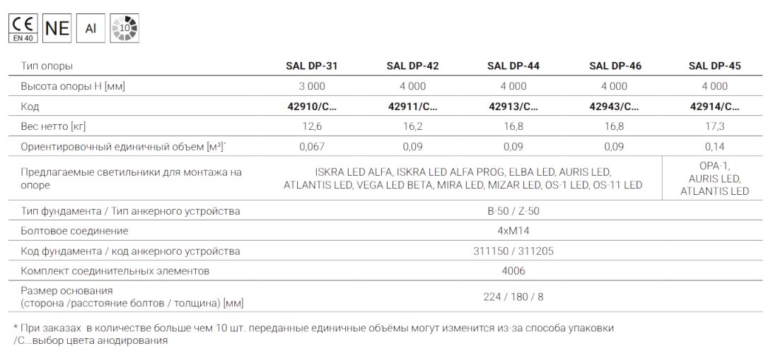 Монтаж светильника: непосредственно на опоре, светильники с креплением ø60 мм с параметрами веса и поверхности, которые не превышают данных из таблицы выдержанности указанных в технической карте.